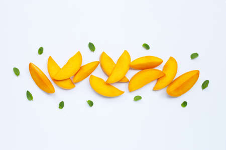Tropical fruit, Mango slices with mint leaves on white background. Top view