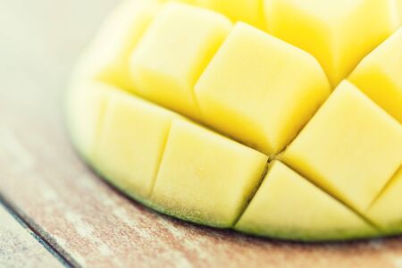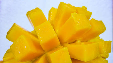 Cut mango to cubs on plate closeup. Slices of organic mango fruit.