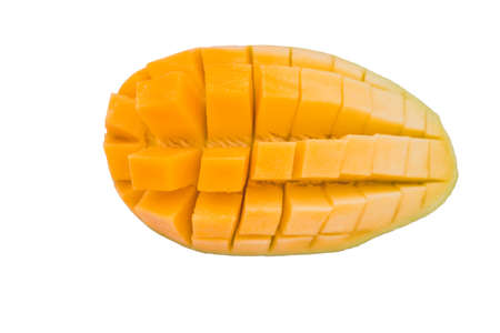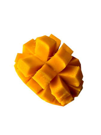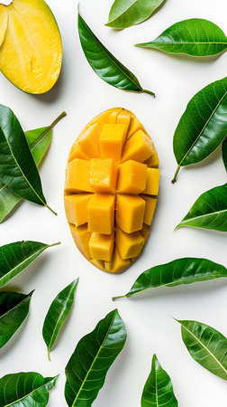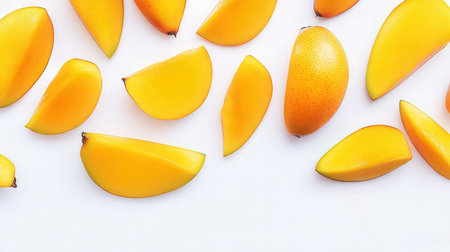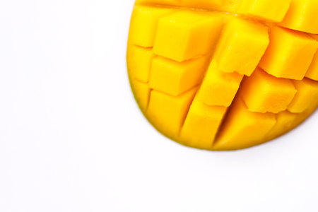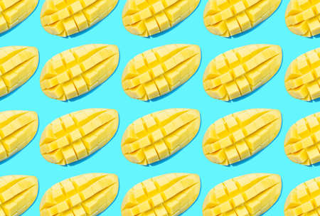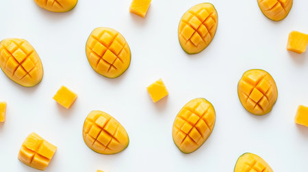 Top view of mango halves and cubes pattern on white background. Ideal for summer recipes and healthy eating.
