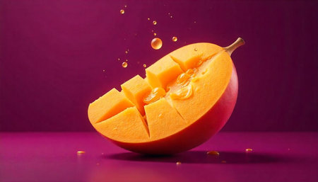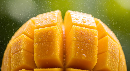 A close-up of a freshly cut, ripe mango with glistening water droplets showcases its juicy, sweet, and healthy qualities against a soft, green backdrop.