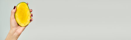 object photo of gourmet delicious mango in hand of young unknown woman on gray backdrop, banner