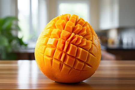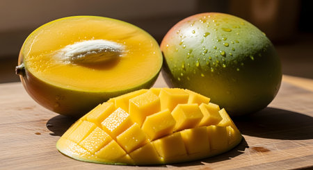 A ripe mango cut in a hedgehog style sits next to a whole mango on a wooden cutting board. Sunlight highlights the juicy texture and water droplets on the tropical fruit.