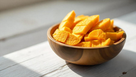 AI Generated. ripe mango cut into cubes and served in a wooden bowl