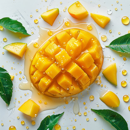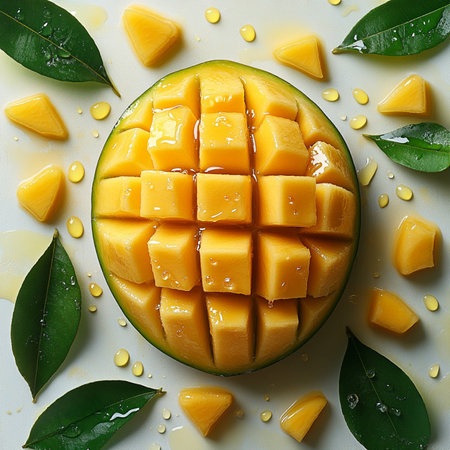 A vibrant, juicy ripe mango is cut in half and diced, with fresh slices and green leaves scattered around, glistening with juice.