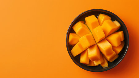 Peeled and cubed mangoes arranged in a ceramic bowl on a bright orange background generative ai