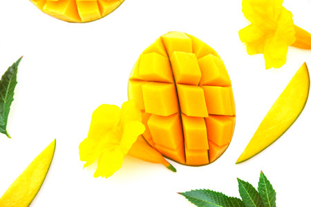 Ripe chopped mango on white with yellow flowers. Vegan beautiful dessert layout on white. Isolated image