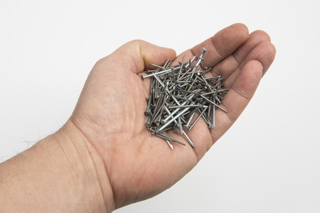A close-up, macro shot shows a worker's hand with dirt on the fingers selecting a single metal nail from a pile of similar nails. The nails are silver and metallic, with visible heads and shafts. They are scattered on a textured wooden surface. The background is blurred, with hints of blue and grey.
