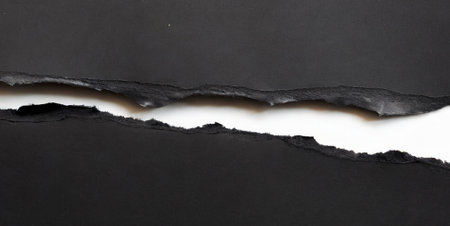 Directly above view of torn paper separating black and white sections, symbolizing contrast, conflict, or visual division.