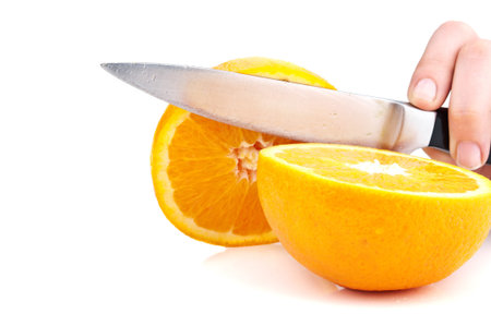on the table, cut oranges near mint leaves and a man cuts an orange in half, on a white background