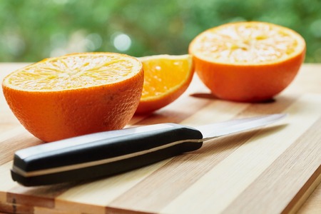 Oranges slice on the wooden cutting board. The fruit is sour or sweet. Often have extra calcium, potassium, vitamin A and vitamin C.