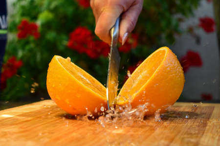 photo of the orange slicing process. A woman cuts an orange into circles with a knife on a wooden board
