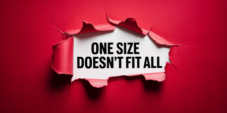 A vibrant red paper is torn open to reveal a white space with the bold black text ONE SIZE DOESN'T FIT ALL prominently displayed.