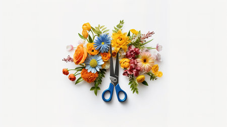 Flower bouquet with scissors on white background. Flat lay, top view