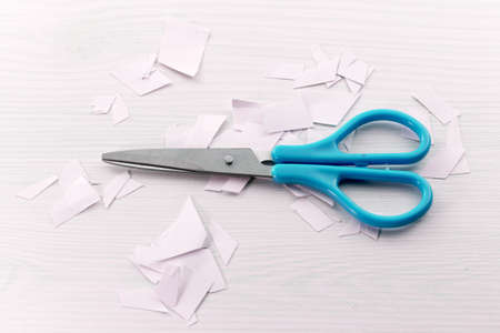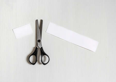 on a light background scissors cut off a piece of paper inscription