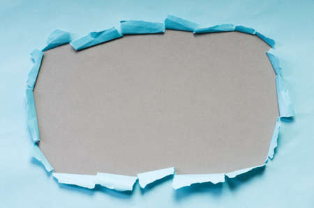 Woman hand with scissors in whole of torn blue paper background