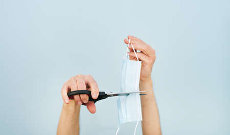 Man hands cutting masks with scissors on blue background. Copy space. Concept covid 19.