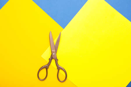 Office stationery scissors and a paper heart cut in half on a pure yellow background