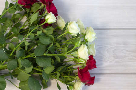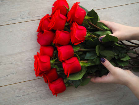 Bouquet of red rose flowers on wooden table. Beautiful spring background for seasonal cards, posters, blogs and web design. Image is with copy space