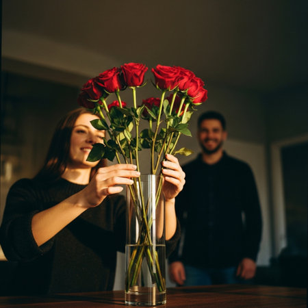 Young couple in love with red roses in glass vase at home.