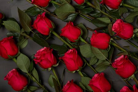 Red roses background. Top view. Valentines Day background. Red roses