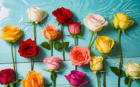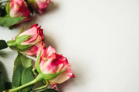 Rose composition on the colored background. Overhead top view, flat lay. Copy space. Birthday, Mother's, Valentines, Women's, Wedding Day concept.