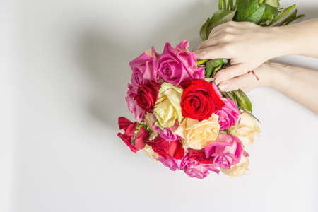 The woman's hands are holding a beautiful bouquet of fresh multicolored roses. Flower composition isolated on white background. Festive card concept