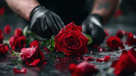 A striking close-up of red roses covered in water droplets, held delicately in a gloved hand. The composition highlights the beauty and elegance of flowers, perfect for showcasing romance and freshness.