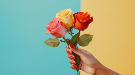 A close-up of a hand holding roses, isolated on a colored background, showcasing the contrast between the flowers and the backdrop.