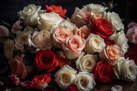 This image was generated using AI. Celebrate Rose Month with this vibrant and luxurious composition of fresh roses in shades of red, pink, and white. Elegantly arranged in a glass vase on a marble surface, the scene is enhanced by soft natural lighting and scattered rose petals, creating a romantic and sophisticated atmosphere, perfect for premium stock photography
