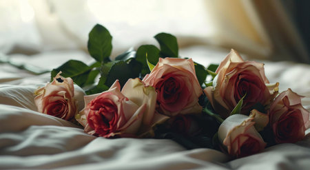 Romantic flat lay of red roses with luxurious velvet ribbon capturing elegance and beauty