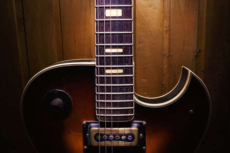 Electric guitar body and neck detail on wooden background vintage look