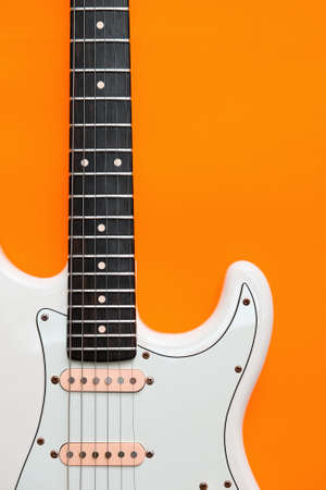 Detail of White Electric Guitar on a orange background.