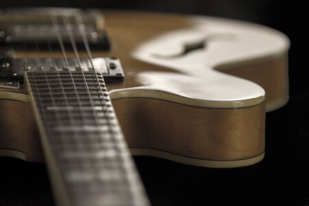 Honey sunburst vintage electric jazz guitar closeup on the black background, with plenty of copy space. Selective focus.