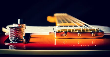 electric guitar closeup of bridge, volume and pickups