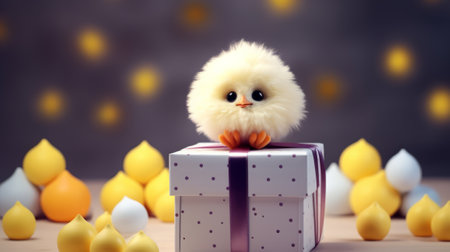 Yellow bird in gift box, pastel eggs, soft background, concept of Easter surprise.