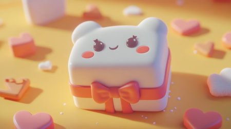 3D rendering of a Valentine's Day background on a peach-colored surface with plenty of copy space. Cute rose and heart-shaped frame decorations in a cartoon style, with a cute, kawaii-style smiling gift box in a white tone with a pink ribbon, viewed from the top with a soft focus. A simple studio setting with a warm light. Minimalistic studio lighting creates a simple yet elegant composition showcasing the objects against a clean backdrop. Captured with a Nikon Z6 II and an f/8 lens, using natural lighting. --chaos 30 --ar 16:9 --v 6.1 Job ID: edd0580f-8316-4b44-bc45-4d2262448ccc