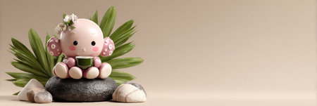 A cute octopus character sips herbal tea while resting on a rock under palm leaves, enjoying a moment of relaxation in soft natural light.