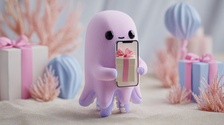 A cheerful octopus mascot is holding a smartphone featuring a gift icon, set against a soft pastel background perfect for a shopping promotion.