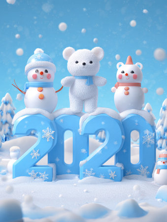 A whimsical 3D illustration features a polar bear and snowmen figures on the numbers 2020. The composition showcases a soft color palette dominated by blues and whites. The overall style is clean with soft textures, suggesting a festive and celebratory theme suitable for various commercial or editorial uses.