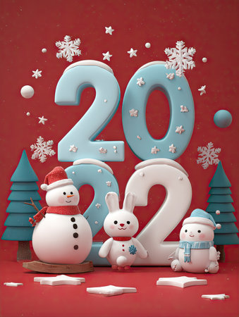 A vibrant illustration showcases the year 2022, accompanied by charming snowman and rabbit figurines. The artwork features a festive red backdrop with whimsical snowflakes and decorative elements. This composition is rich in texture and color, suitable for various holiday-themed projects and commercial applications.