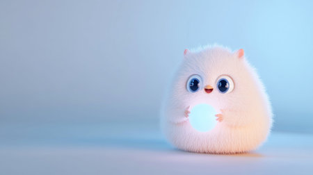 A cute cartoon character with big eyes and a fluffy body holding a glowing object. The character is set against a soft blue background.