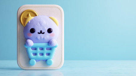 3D rendering or illustration of a light purple creature, designed in a kawaii style. The creature is sitting in a light blue shopping cart, which is part of a white frame. The background is a soft, light blue color.