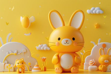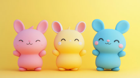 This delightful image features three colorful bunny figures in pastel shades, evoking feelings of joy and playfulness against a bright yellow background. Perfect for childrens themes!
