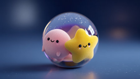 This image features two whimsical cartoon characters, a pink blob and a yellow star, encased within a clear glass sphere. The scene is set against a soft, blurred blue backdrop. The characters have simple, friendly expressions. This illustration could be used for various projects, including advertising or educational materials.