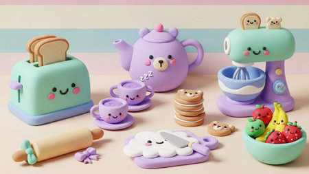 A charming collection of pastel-colored, anthropomorphic kitchen toys including a toaster, teapot, mixer, and food items.