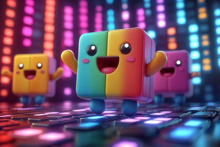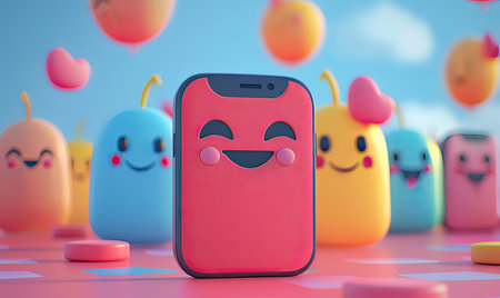 Vibrant and playful 3D illustration featuring colorful emoji characters, rainbows, stars, and other whimsical elements