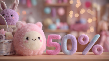 Kawaii plush toy sits on wooden table next to Sale sign. Warm bokeh lights in the background, creating a dreamy, cozy atmosphere for shop promotion or seasonal sale