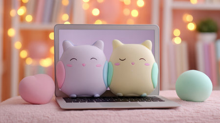 Pastel-colored kawaii owl plush sits next to an open laptop in a softly lit room, surrounded by warm bokeh fairy lights