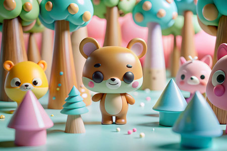 Cute bear in pastel forest, adorable woodland creatures, whimsical 3D scene