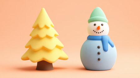 Whimsical winter scene featuring a smiling snowman and a bright yellow Christmas tree against a soft pastel background, perfect for holiday cheer and festive designs.